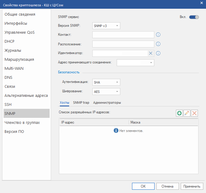 SNMP. В правой части окна появятся текущие настройки доступа по протоколу SNMP: