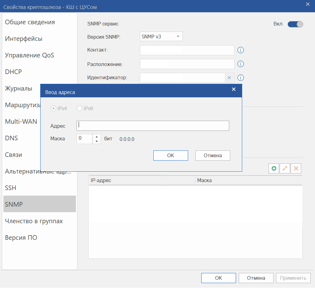 Хостыв полеСписок разрешенных IP-адресовнеобходимо указать IP-адрес сервера Smart Monitor Data Collector. Для этого нажмите кнопку+, в открывшемся окне укажите разрешенный IP-адрес, маску и нажмите кнопкуОК: