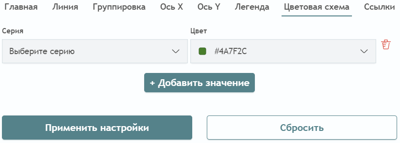 The Color tab contains settings of the chart color scheme. You can set a different color for each series of the chart. To do this, press the Add new value button, then specify the parameters for the series.